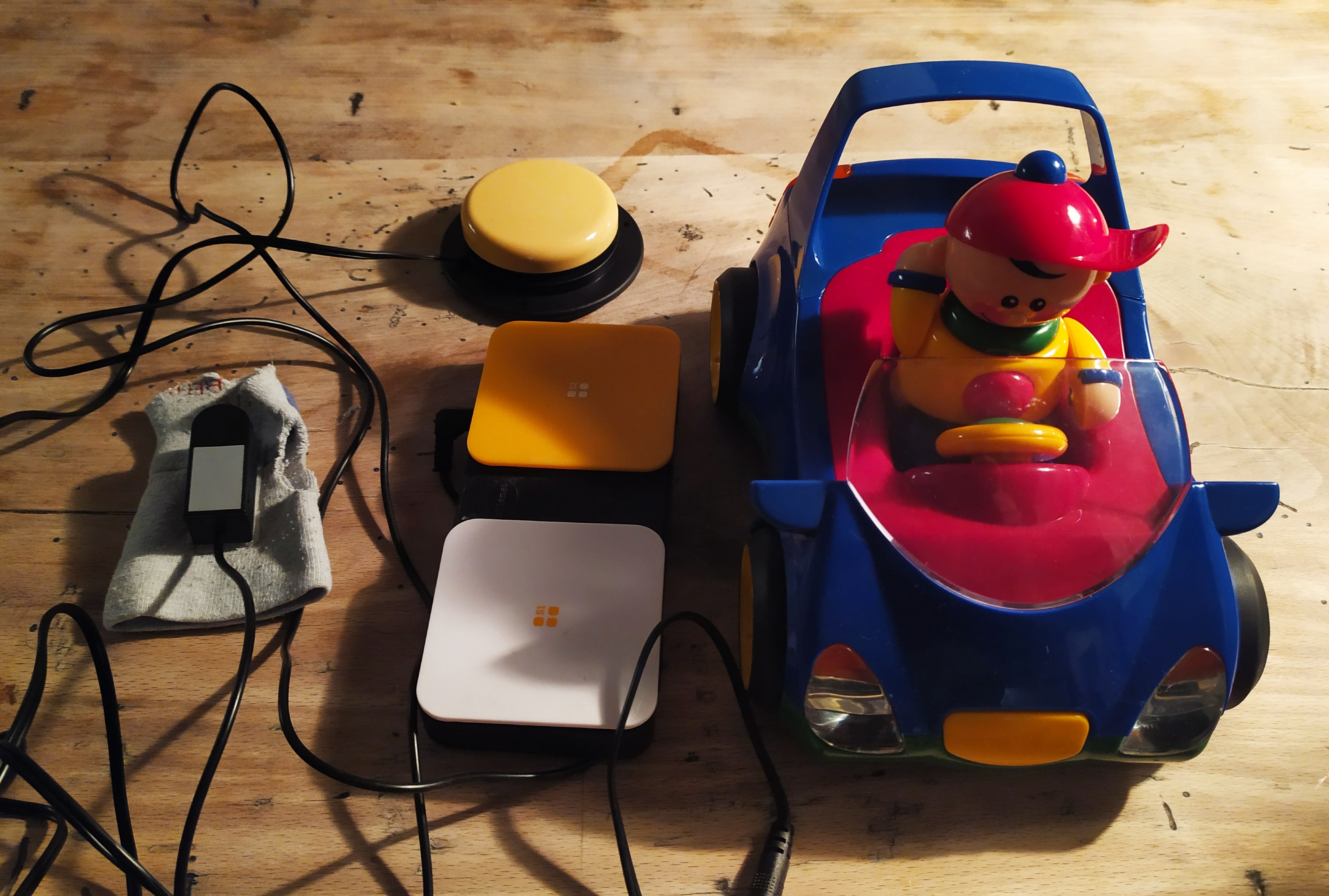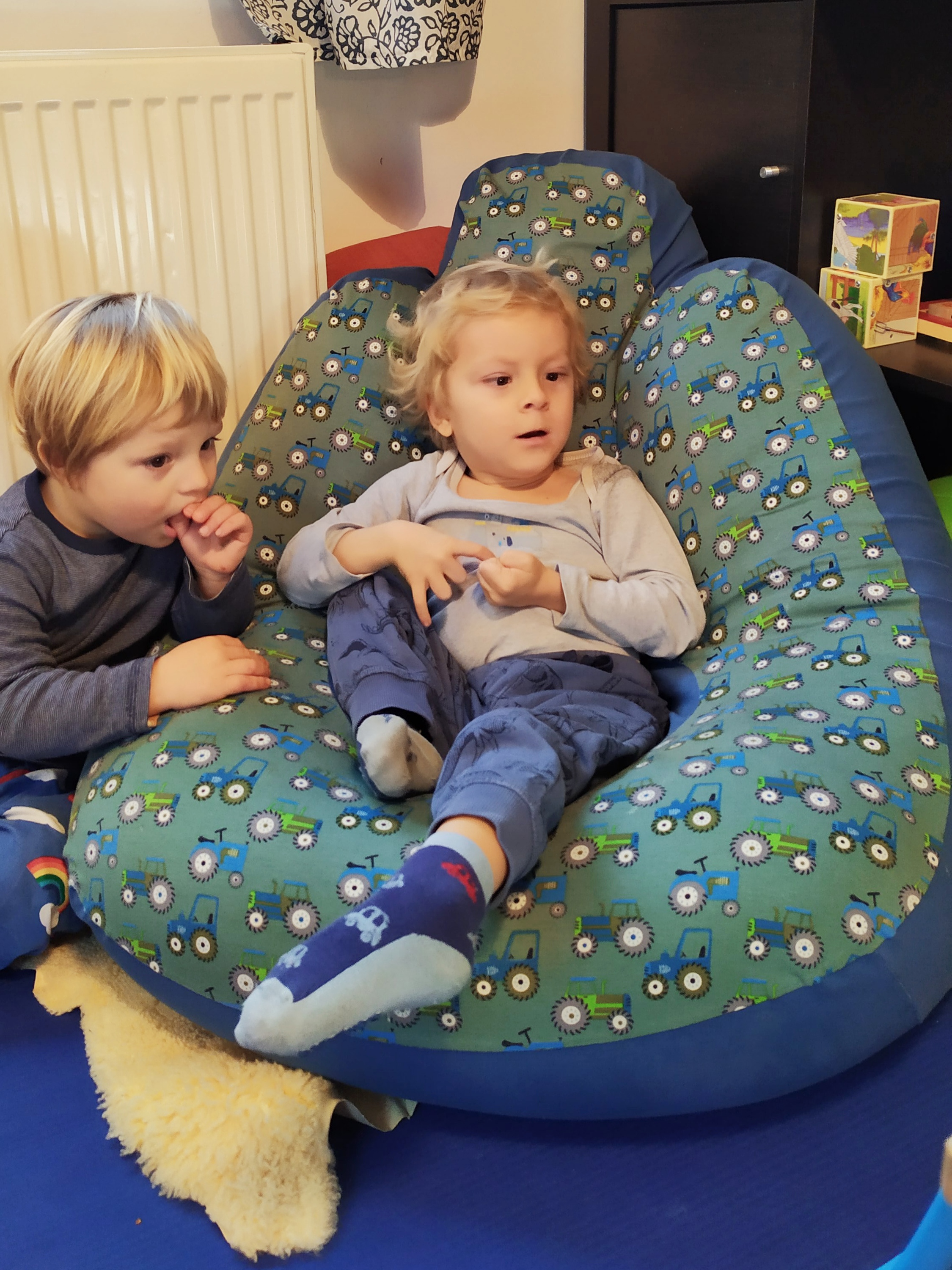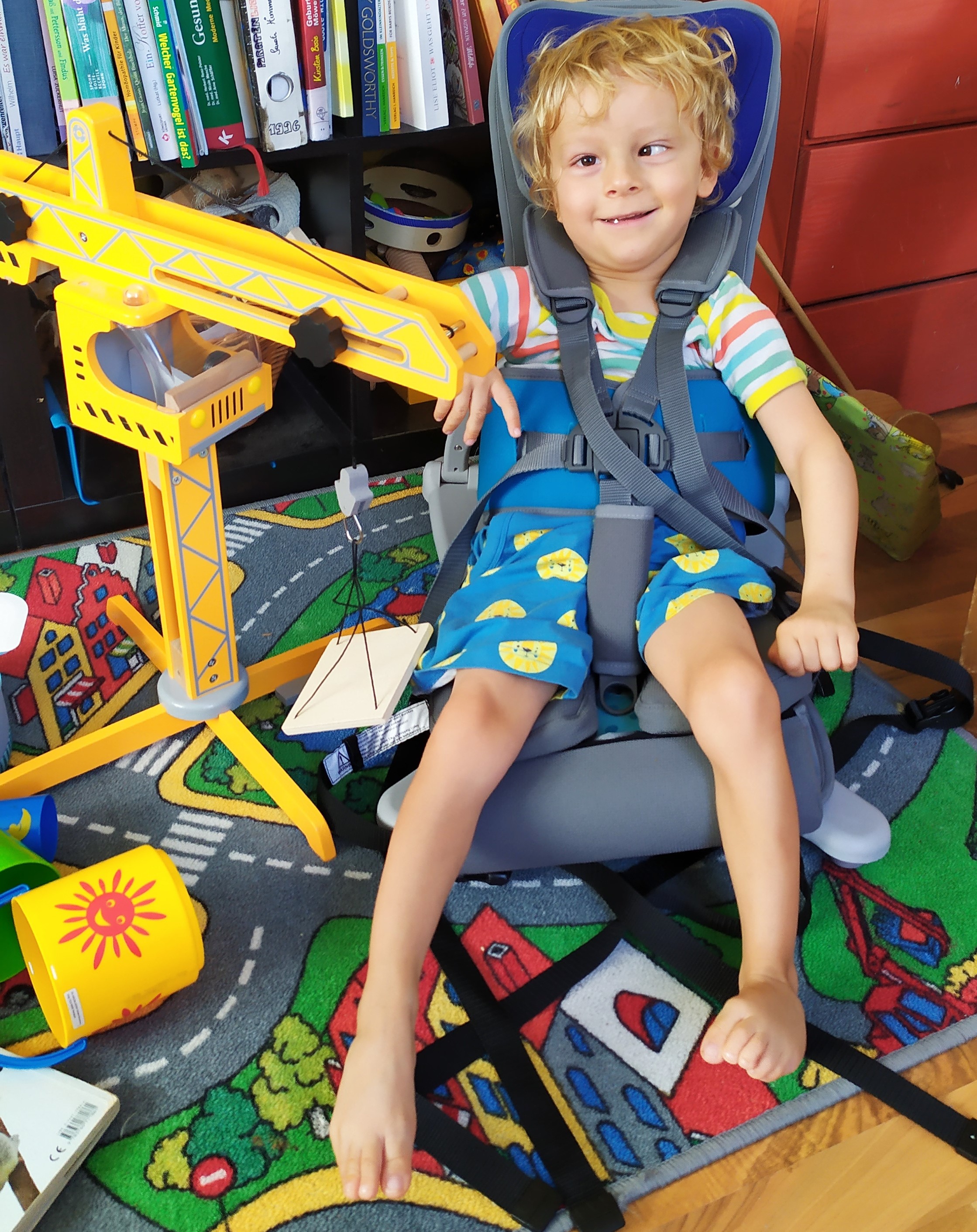 Neben meinem Davidflitzerrolli und vielen helfenden Händen, die zum Beispiel eine Fahrt mit dem Bobbycar ermöglichen, gibt es auch viele kleine Dinge und tolle Therapien, die mir den Alltag sehr erleichtern oder mir neue Möglichkeiten eröffnen. Zum Beispiel kann ich mit meinem neuen Traktorpolster (Snoezi) viel besser mit meinen Freund*innen am Boden spielen, Bücher anschauen – dabei sein und bequem sitzen. Durch den „GoTo“, das ist ein spezieller tragbarer Sitz, kann ich auch unterwegs gute Sitz- und Spielmöglichkeiten finden. In meiner Schaukelschale versuche ich mich selbst zu schaukeln und zu drehen. Meine Taster ermöglichen mir zum Beispiel die Bedienung eines speziell adaptierten Spielzeugrennautos oder das Spielen mit dem I-Pad…